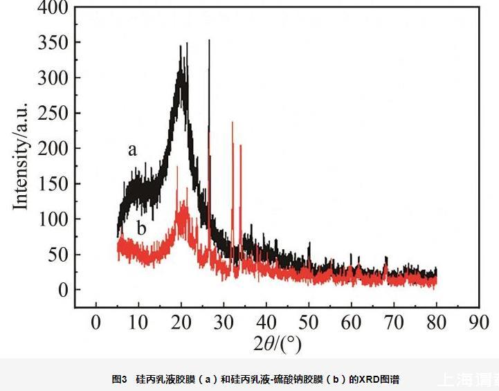 图3硅丙乳液胶膜(a)和硅丙乳液-硫酸钠胶膜(b)的XRD图谱