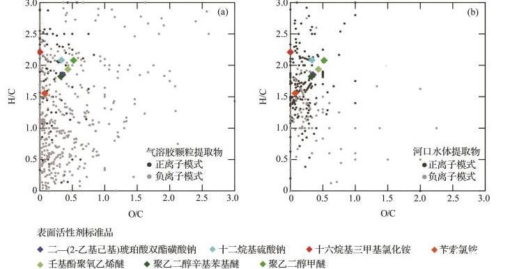 图1气溶胶颗粒(a)和河口水体(b)表面活性剂类有机物的Van Krevelen图