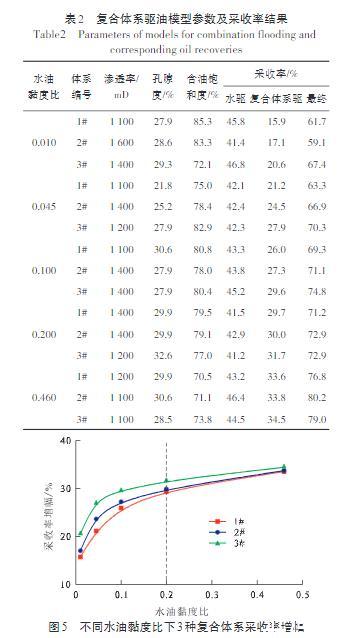 为验证上述判断,同时确定上述界限值,补充了水油黏度比分别为0.010,0.100和0.200条件下的驱油实验,模型参数及采收率结果汇总如表2和图5所示。