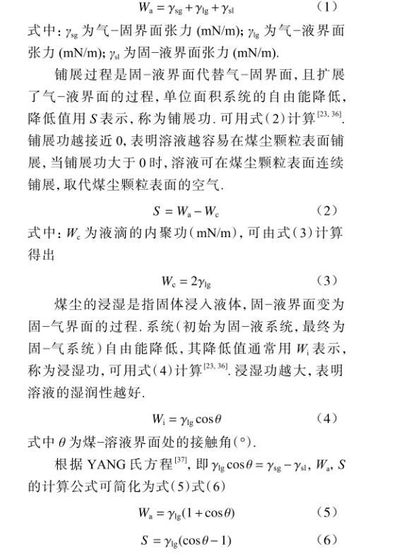 铺展过程是固~液界面代替气~固界面,且扩展了气~液界面的过程,单位面积系统的自由能降低,降低值用S表示,称为铺展功。可用式(2)计算。铺展功越接近0,表明溶液越容易在煤尘颗粒表面铺展,当铺展功大于0时,溶液可在煤尘颗粒表面连续铺展,取代煤尘颗粒表面的空气。