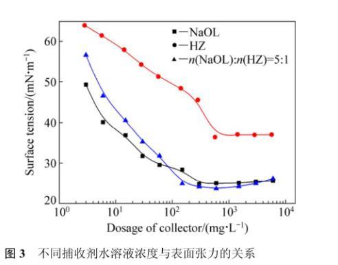图3不同捕收剂水溶液浓度与表面张力的关系