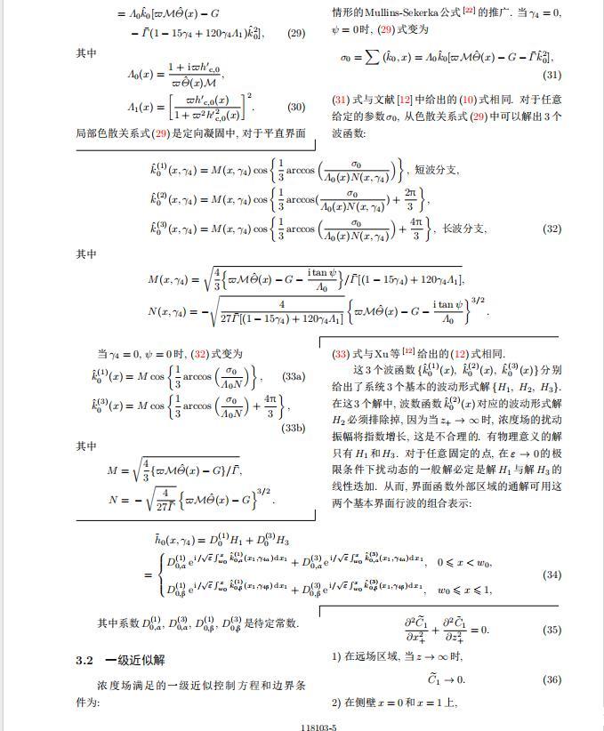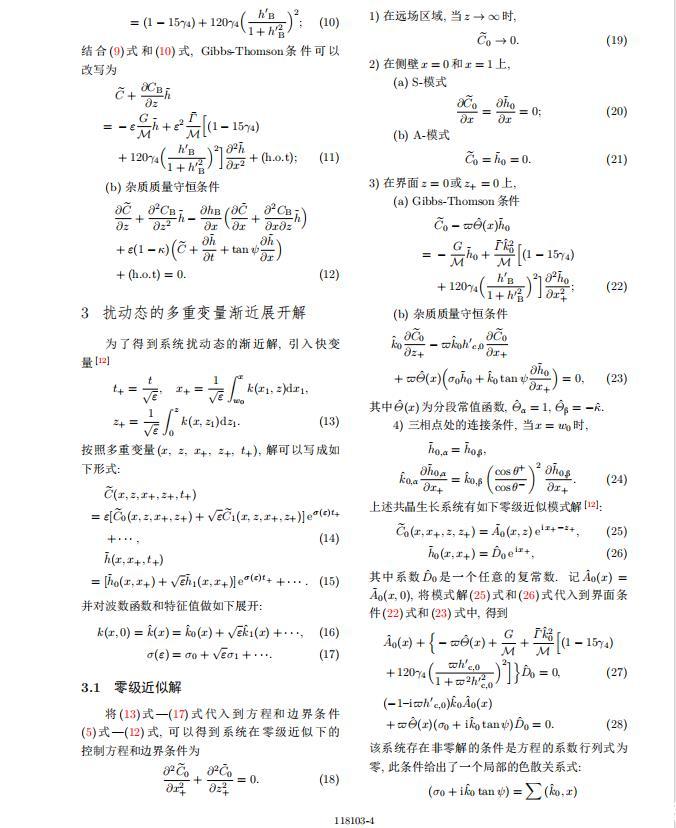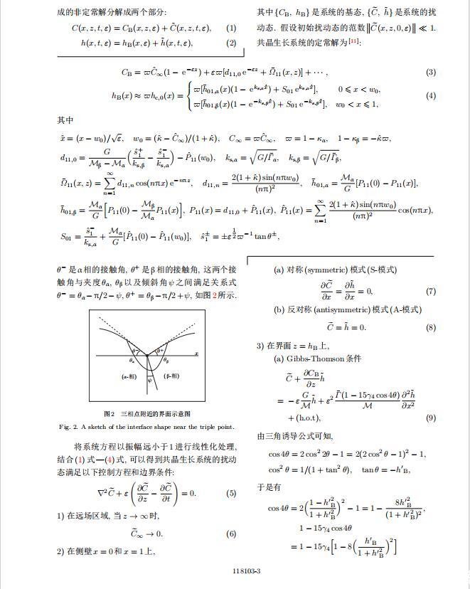 为考察共晶生长形态稳定性,利用共晶生长的定常解作为基态进行稳定性分析.在初始时刻t=0时对基态解做一小扰动,并将在t>0以后形成的非定常解分解成两个部分: