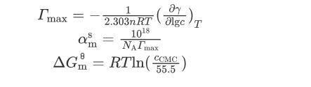 式中:γ为表面张力,mN/m;c为表面活性剂的浓度,mol/L;T为温度,298 K;R为摩尔气体常数,8.314 J/(mol·K);n为与表面活性剂性质相关的参数,对于本文研究的非离子表面活性剂,n=1;N A为阿伏加德罗常数;c CMC为临界胶束浓度,mol/L。