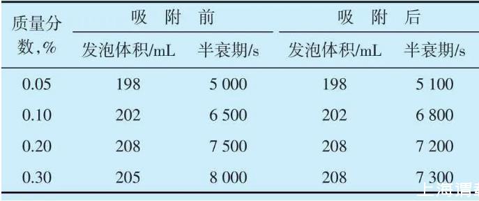 配制质量分数为0.05%,0.10%,0.20%和0.30%的磺基甜菜碱泡沫剂,再分别充入纯度为99.9%的氮气,利用罗氏泡沫仪测试氮气泡沫体系吸附前后的泡沫性能。评价结果(表1)表明,当温度为80℃时,不同质量分数的氮气泡沫体系在吸附前后发泡体积均保持在200 mL左右,半衰期大于5 000 s,表明均具有良好的起泡性能和稳定性能。