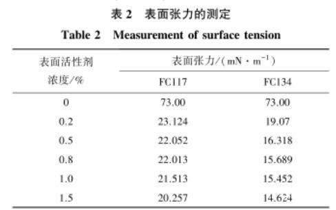 由表2可知,随着FC117和FC134两种表面活性剂溶液浓度的增加,溶液的表面张力先迅速降低,再逐渐趋于稳定。当表面活性剂浓度从0增加至0.2%时,表面张力从初始的73 mN/m分别降至23.124 mN/m和19.07 mN/m,表面张力大幅度地降低;当表面活性剂浓度从0.2%增加至1.5%时,表面张力变化幅度较小,保持着较小程度的降低,并趋于稳定。