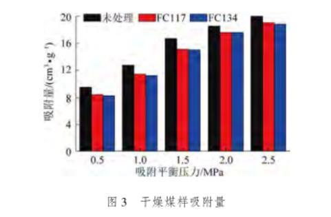 由图3可知,随着甲烷吸附平衡压力的增加,气润湿反转剂处理前后煤样的吸附量均逐渐增加,且增加量均呈现逐渐减小趋势。经过气润湿反转剂FC117和FC134处理后的煤样吸附量始终小于未处理的煤样。其中,产生该现象的原因主要为:一方面,气润湿反转剂分子自身占有一定的体积,随水溶液一同进入煤体内部。在干燥过程中,水分通过蒸发作用排出煤体,而气润湿反转剂分子则滞留在煤体内部,进而减小甲烷分子的吸附空间;另一方面,气润湿反转剂具有低表面张力的特性,在吸附在煤体内部孔隙裂隙的表面,降低其表面自由能,减小对甲烷分子的吸附能力,进而使得吸附量下降。
