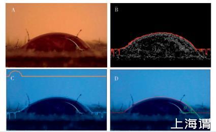 A.显微镜拍摄的叶面测试液滴B.用Canny算法进行边缘检测(红色线为提取的轮廓曲线)C.轮廓拟合(黄色线为去除干扰后的轮廓曲线)D.确定并测定接触角(红色线为优化后的轮廓曲线,右侧两条绿色线的夹角即为接触角θ)。放大倍数为1 000倍