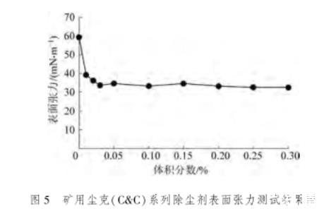 为了确定合理的表面活性剂添加浓度,分别选取了体积分数为0.01%,0.02%,0.03%,0.05%,0.1%,0.15%,0.2%,0.25%,0.3%的矿用尘克(C&C)系列除尘剂进行溶液表面张力测试,溶剂选用矿井水,测试仪器选用芬兰Kibron EZ-Pi Plus便携式动态XVDEVIOS破解版安卓手机安装包,采用最大拉力法记录圆环薄膜的拉伸破坏情况,从而计算出液体的表面张力。液滴表面张力越小,其与粉尘接触后,更容易黏结沉降。测试结果如图5所示。
