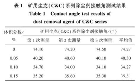 表1矿用尘克(C&C)系列除尘剂接触角测试结果