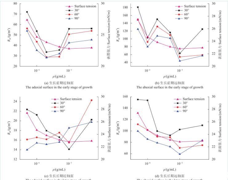 图6为不同浓度SilwetL-77溶液在苹果叶片近、远轴面的Rm变化规律。由图可知,当溶液质量浓度低于cmc时,苹果叶片生长前、后期远轴面的Rm值和表面张力均随溶液质量浓度的降低而减小。此外,苹果叶片生长后期近轴面只有在30°倾角时的Rm值与表面张力随溶液质量浓度的提高而减小,60°倾角和90°倾角时Rm值随溶液浓度变化不大。苹果叶片生长后期远轴面Rm值和表面张力随溶液浓度的变化与生长前期基本一致。