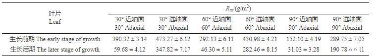 以上结果表明,苹果叶片生长前期近轴面的Rm值高于生长后期,且在同一生长期,苹果叶片远轴面的Rm值远高于近轴面。此外,苹果叶片的Rm值随叶倾角的增大而减小。