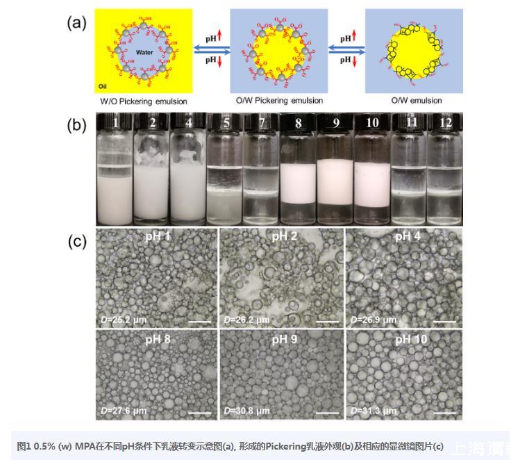 图10.5%(w)MPA在不同pH条件下乳液转变示意图(a),形成的Pickering乳液外观(b)及相应的显微镜图片(c)