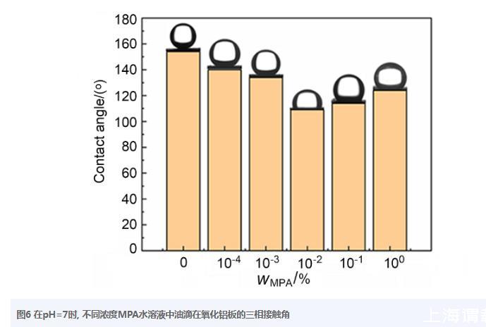 图6在pH=7时,不同浓度MPA水溶液中油滴在氧化铝板的三相接触角