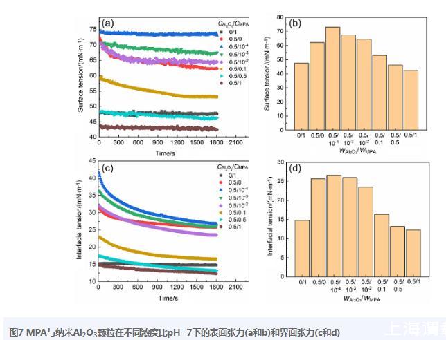 图7 MPA与纳米Al2O3颗粒在不同浓度比pH=7下的表面张力(a和b)和界面张力(c和d)