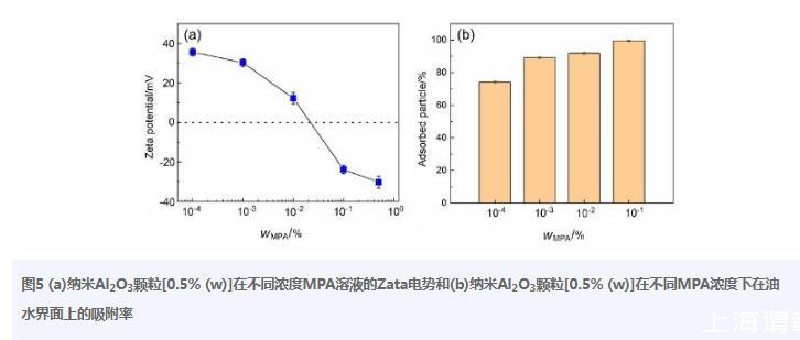 图5(a)纳米Al2O3颗粒【0.5%(w)】在不同浓度MPA溶液的Zata电势和(b)纳米Al2O3颗粒【0.5%(w)】在不同MPA浓度下在油水界面上的吸附率
