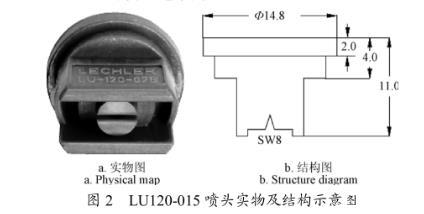试验喷头为德国LECHLER公司生产的空气诱导喷头IDK120-025和多量程平面喷头LU120-015,其结构及尺寸如图1和图2所示。