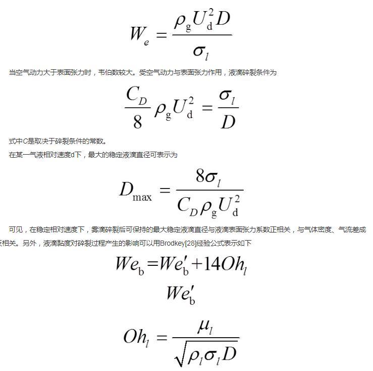 对于低黏度液体,当液滴处在稳定气流场中,其变形取决于空气动力(0.5gd2,g是气体密度,kg/m3;d是气液流速差,m/s)和表面张力系数与液滴直径比(1/)。