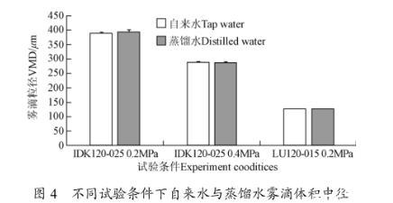 图4不同试验条件下自来水与蒸馏水雾滴体积中径