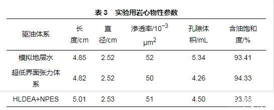 通过岩心动态驱替实验评价体系提高采收率的能力,实验装置见图1。采用不间断驱油的方式,以0.3 mL/min的注入流量驱油。分别考查模拟地层水、HLDEA+NPES体系和超低界面张力体系的驱油性能。实验用岩心物性参数见表3。实验的具体步骤如下。