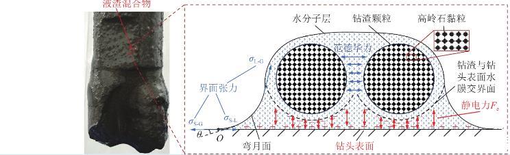 式(1)表明,包裹钻渣颗粒的“水膜”与钻头表面“水膜”形成的整体受弯月面处界面张力作用,被不断沿钻头表面方向“拉扯”,使钻渣颗粒被界面张力“绑缚”于钻头表面(图3)。但仅依靠界面张力显然无法抵抗钻具高速旋转产生的离心力,静电力与界面张力的共同作用导致了泥化钻渣黏附于钻具表面,且静电力对液渣混合物的黏附发挥了重要作用。