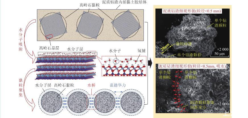 图2中,在微观尺度层面,由于高岭石形成过程中发生同晶置换,使晶层表面带永久负电荷。当高岭石黏粒遇水时,水分子的偶极性使氢原子易与高岭石晶层表面电负性较强的氧原子结合形成氢键,同时,吸附在晶层表面的水分子之间也会通过氢键连接,该过程即为水分子的吸附过程。当第1层水分子被高岭石黏粒吸附后,其外侧氧原子呈负电性,继续与第2层水分子的氢原子以氢键形式结合,最终形成多层水分子“水膜”。高岭石黏粒不断吸水扩层,使钻渣颗粒体积不断膨胀,同时伴随钻渣内部非泥质矿物的溶解,高岭石黏粒间距变小,并通过外侧“水膜”相互吸附,构成“水桥”,使得多个高岭石黏粒能够在遇水后聚集,形成更大的团聚体。