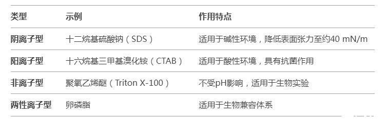 阴离子型十二烷基硫酸钠(SDS)适用于碱性环境,降低表面张力至约40 mN/m