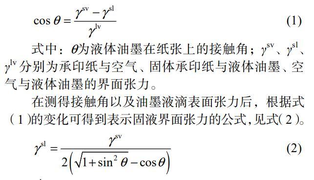 式中:θ为液体油墨在纸张上的接触角;γsv、γsl、γlv分别为承印纸与空气、固体承印纸与液体油墨、空气与液体油墨的界面张力。在测得接触角以及油墨液滴表面张力后,根据式(1)的变化可得到表示固液界面张力的公式,见式(2)。