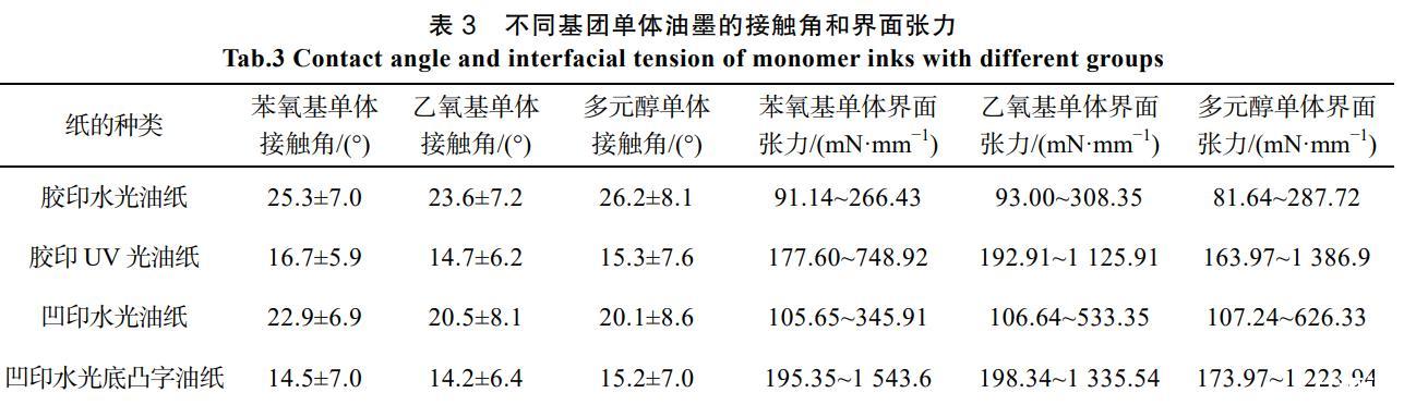 表3不同基团单体油墨的接触角和界面张力