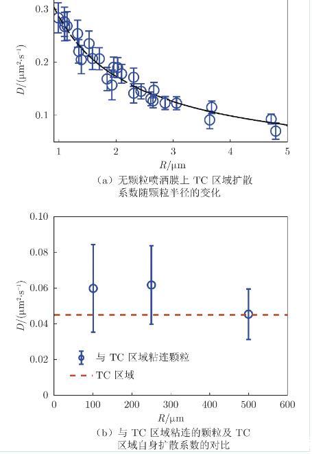 在LE–TC共存相膜上,所有颗粒均与TC区域边缘粘连,因此难以确定颗粒的等效粒径,本节只对其扩散系数进行讨论。首先,由实验测量了无颗粒喷洒膜上TC区域的扩散系数(图9(a)),由HPW模型拟合: