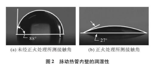 Qu等研究发现,当毛细管内表面被包覆或被制造的有空腔或粗糙度时,启动振荡运动所需的过热温度和热量降低,脉动热管更容易启动。Hao等研究了超亲水和亲水表面对脉动热管传热性能和液塞运动的影响。