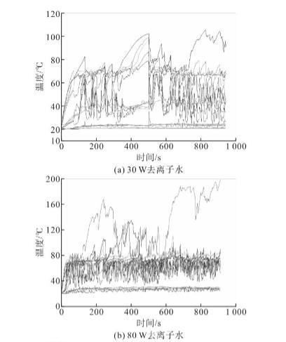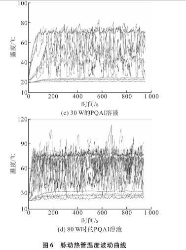 研究了充灌量对脉动热管运行稳定性和热性能的影响,结果表明50%为最佳充灌率。因此,本文采用了50%的充灌率。图6显示了不同加热功率下采用去离子水或PQAI水溶液脉动热管的温度波动曲线。