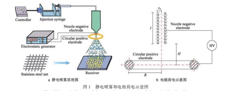 静电喷雾装置主要由高压静电发生器、控制器、微量注射器、喷嘴电极、环形电极和接收板组成,如图1a所示。喷嘴电极连接高压静电发生器的负极,环形电极接高压静电发生器的正极。高压静电发生器输出负高压,在喷嘴电极会产生大量的负电荷,同时环形电极上会感应出正电荷。调节静电发生器的参数,控制喷嘴电极和环形电极之间的电场强度。将微量注射泵固定在支架上,使用微量注射泵将溶液匀速泵送到喷嘴处。液体从喷嘴喷出时与高压电极接触,使电极上的电荷传导到液体。带电液体在静电力、电荷互斥力、重力、环境复合力的作用下,破碎成细小液滴,并均匀地吸附在工件上。