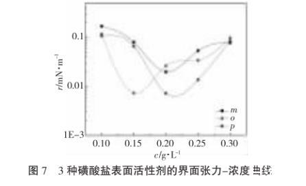 用旋滴界面张力仪测定45℃下烷基二甲苯磺酸盐的界面张力。配制浓度分别为0.1,0.15,0.2,0.25,0.3g·L-1的3种磺酸盐表面活性剂的溶液。测定与大庆采油二厂原油的界面张力,其测定结果见图7。
