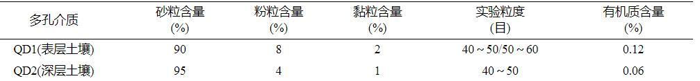 本研究选用的两种多孔介质分别为QD1(表层20~40cm土壤)和QD2(地下50~100cm深层土壤),均采自青岛市崂山区某农田。经过自然风干后,将其筛分为40~50目和50~60目。实验选用土壤中的金属氧化物含量均较低,主要差异为有机质含量。土壤样品的性质见表1。