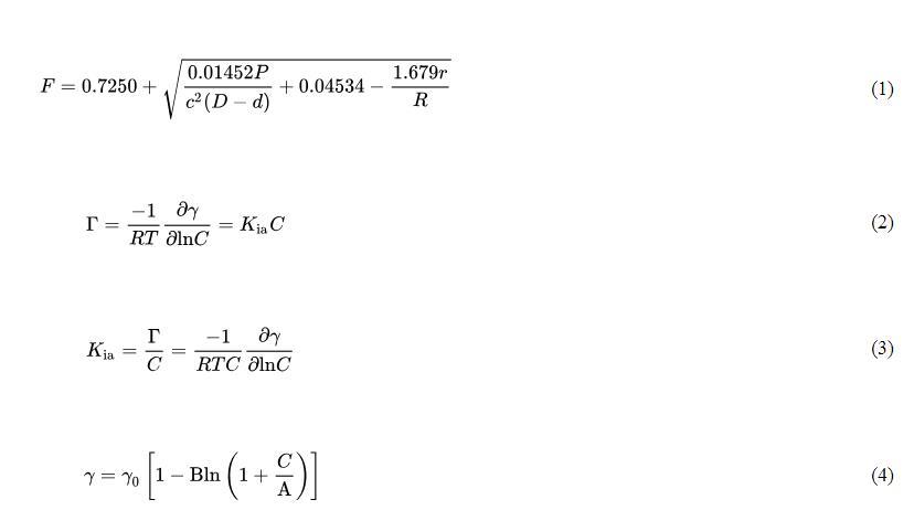 实际表面张力(γ)由仪器表面张力读数(P)、校正因子(F)和实验相关常数相乘得到。校正因子计算如公式(1)所示;气-水界面吸附系数通过Gibbs吸附等温方程得到,见公式(2)和公式(3);将Szyszkowski方程应用于表面张力数据,见公式(4),该方程提供了一种计算数值的统一方法。