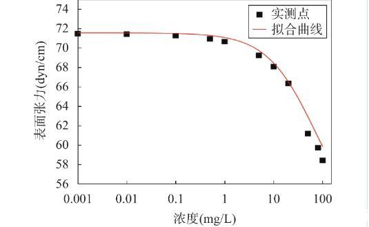 在0.01mol/L氯化钠溶液中测量所得的6∶2氟调磺酸表面张力如图1所示,图中实心点表示同一浓度下表面张力的实际平均值,曲线是基于Szyszkowaki方程拟合所得。利用该方程拟合的相关参数A和B的值分别为12.70和0.075。实验结果显示实测数据点与拟合曲线偏移量较小,这证实了Szyszkowaki方程对本实验体系的表面张力数据具有良好的拟合效果。
