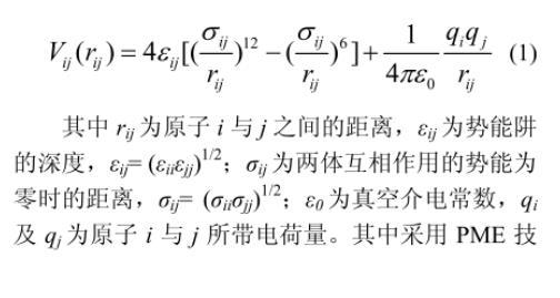 在计算过程中,综合考虑了系统内分子间非键结作用力(范德华力、库伦静电力)及分子内键结作用力(键拉伸和键弯曲)。分别采用Lennard-Jones势能函数模拟范德华力,库仑定律模拟库仑静电力,具体分子间势能函数如式(1)所示
