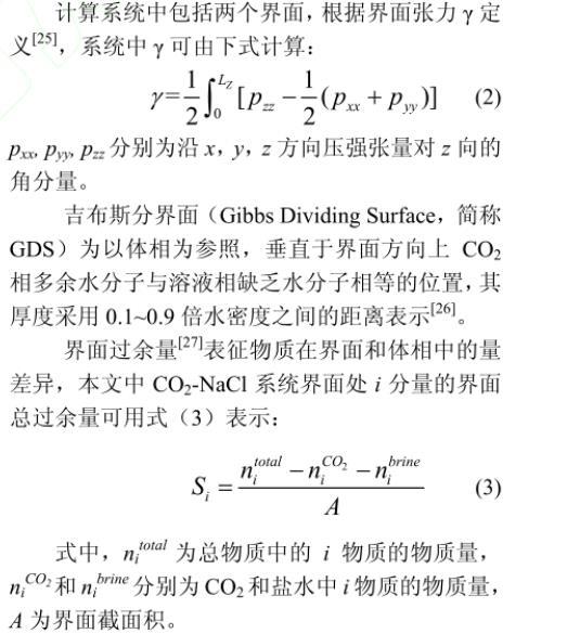 界面过余量表征物质在界面和体相中的量差异,本文中CO2-NaCl系统界面处i分量的界面总过余量可用式(3)表示