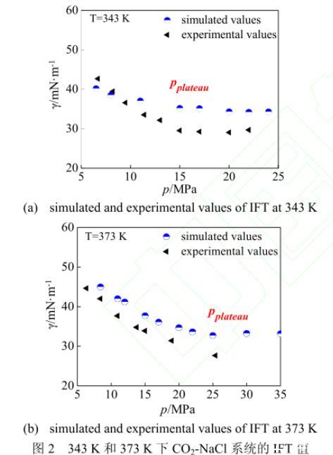 本文分别模拟了343 K和373 K的各压强下盐浓度为1.89 mol·L-1的CO2-NaCl系统,IFT的计算结果示于图2。由图2可以看出,模拟所得的IFT值与Chalbaud等的实验数据吻合较好。在温度为343 K时[图2(a)],IFT值随着压强的不断升高,其减幅逐渐下降,最终在压力平衡点pplateau=15 MPa之后达到稳定值34 mN·m-1。373 K时[图2(b)]的IFT值变化与343 K时极为相似,IFT值同样随着压强的升高而下降,且下降速度不断趋于平缓,由于高压情况下实验设备等因素受限制,实验方法尚未得到25 MPa以上的数据点,故在实验压强范围内并未观测到压力平衡点。而本文应用分子模拟的方法,成功模拟了25~35 MPa下的CO2-NaCl系统,观测到压强在pplateau=25 MPa之后达到稳定值33 mN·m-1。