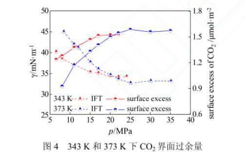 图4 343 K和373 K下的界面张力和CO2界面过余量