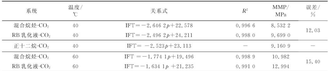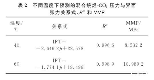 将拟合直线向横轴方向继续延伸,与压力轴会有一个交点,该交点的物理意义即界面张力为零时的压力大小。根据CO2的驱油机理和最小混相压力所表现的特征,该点的横坐标值即为实验对象在特定温度下的MMP。表2列出了40℃和60℃下所测气液之间的压力与界面张力的关系式和相关系数,以及对最小混相压力的预测。