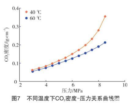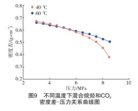 一方面,高温可以对液体分子之间的相互作用力产生削弱作用,加剧分子间的不规则运动。此时,CO2气体分子更容易与液相发生混溶,而定量表现出来的就是界面张力的降低。另一方面,根据混合烷烃和CO2的密度和二者的密度差数据,绘制出不同温度下CO2气体密度和气液密度差随压力升高的变化曲线,如图7~图9所示。从密度差-压力曲线(见图9)来看,随着温度升高,在可比较的实验压力范围内,中低压(3~6 MPa)下不同温度的气液密度差非常接近,可以忽略不计。但高于6 MPa后,高温下气液密度差逐渐加大。较高的密度差导致了气液难以形成混相,同一压力下界面张力更大。