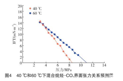 Kazemzadeh Y等的研究表明,平衡的CO2气-油系统的界面张力通常随着压力线性降低,直到界面张力-压力趋势发生变化时,这时的压力称为临界压力,但界面张力为零的瞬间很难捕捉到。本实验中,在温度为40℃、压力为8.5 MPa时,可以观察到滴液针管中的混合烷烃不再形成椭圆形液滴,直接和CO2发生混溶而无断续地流入釜中,所以无法通过实验测量准确地得到CO2和混合烷烃界面张力为0时的对应压力,即最小混相压力。因此,采用外推法预测最小混相压力。以横轴为压力值,纵轴为混合烷烃在被盐水饱和的CO2环境下界面张力值的坐标系中分别绘制40℃和60℃压力和界面张力的散点图,如图4。从图4可看出,随着压力的升高,界面张力呈线性降低的趋势。