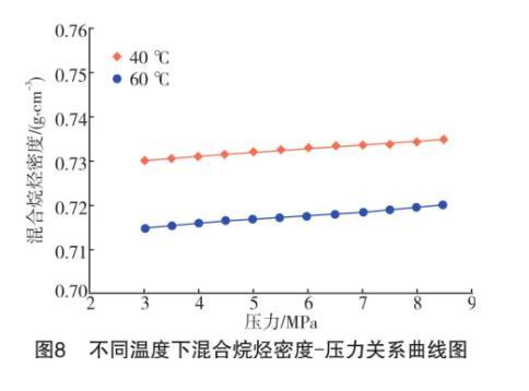 从混合烷烃密度-压力曲线(见图8)来看,整个测试压力区间内温度对混合烷烃的密度影响不大,因此液体密度也不会造成界面张力的较大变化。从CO2密度-压力曲线(见图7)来看,温度在中高压下对CO2密度的影响较大。尤其是在3.5 MPa之后,60℃下的气体密度随着压力升高速率明显高于40℃时的速率。在同一压力下,气体密度随着温度升高显著降低。密度较低的CO2气体分子分布越稀疏,与烷烃液面直接接触的气体分子越少,故降低了二者发生萃取和混溶的概率,间接地导致液体的界面张力值增加。