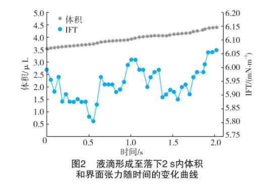 图2为40℃、6.5 MPa时,液滴形成至落下的2 s内液滴体积和测得的界面张力随时间的变化。由图2可看出,在落下过程中体积逐渐变大,界面张力误差在0.3 mN/m之内,虽然浮动不是很大,但任取一点不能较好地体现整体。因此,选择在悬滴完全形成开始计算,到完全落下以帧为间隔,因为液滴完全形成时可以较清晰地得到液滴的最大曲率半径,批量计算这段时间内的界面张力值,最后得到其平均值。为避免液滴的随机性,在每种环境下选取3个连续滴落的液滴的平均界面张力值作为最终结果。减少了实验的偶然性,使得到的结果更加可信。