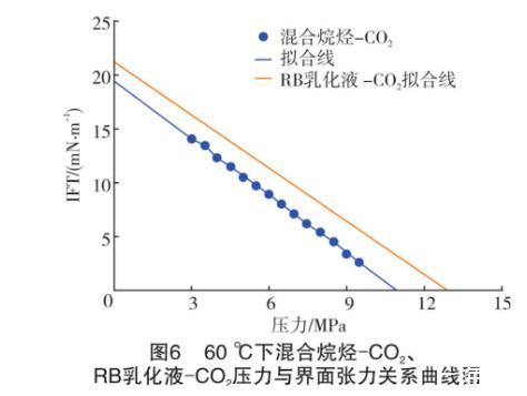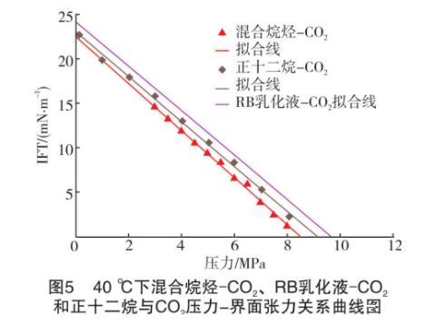 假设RB乳化液-原油不考虑斜率变化部分,始终以低压阶段(小于6 MPa)的斜率表示界面张力的变化。将表中同一温度下不同系统的关系式展现在曲线图上(见图5和图6)。从图5和图6可知,不论在哪个温度下,混合烷烃和RB乳化液的压力-界面张力曲线都接近平行,即两种油的界面张力随着压力的升高几乎以同样的速度降低。计算得知,40℃和60℃下实验混合烷烃和RB原油的压力-界面张力关系式中的斜率误差为6.0%和8.6%。纵观两种油的组成发现,本实验所使用的混合烷烃中正十二烷的摩尔分数达71.07%,而RB原油中的C12+的摩尔分数达到57.66%。也就是说,混合烷烃和原油的组分中占主导作用的是高碳数的正构烷烃。据姬泽敏等的大量实验研究,界面张力在不同的正构烷烃-CO2体系中具有极好的规律性,在相同的温度压力条件下,正构烷烃的碳数和界面张力成正比关系。从文献中RB原油组成分析得知,C12+的分子量高达366 g/mol,而本实验中的混合烷烃的分子量仅为156.74 g/mol。由此得知,实验误差的主要来源是高碳正构烷烃的组成不同。