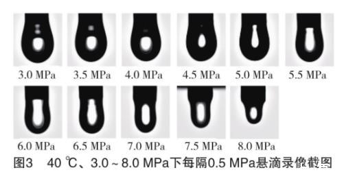 实验后得到的直接数据是一系列的悬滴录像,图片示例如图3所示。根据录像计算不同温压下混合烷烃和CO2的界面张力。