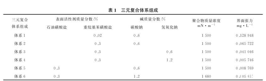(4)实验用三元复合体系的组成见表1,界面张力分布在3个数量级。