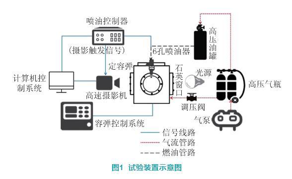 图1为试验装置示意图,主要由计算机控制系统、喷油系统控制器、高压燃料供给系统、定容弹系统、高速摄像装置等组成。
