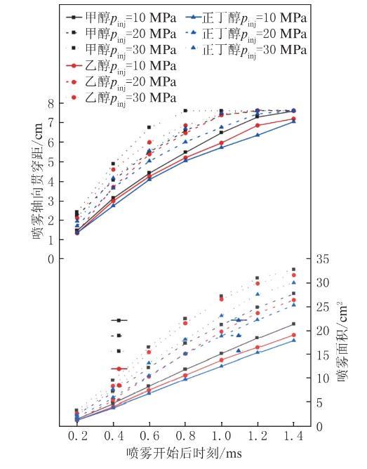 图2为3种醇类燃料在背压0.1 MPa、环境温度20℃时,不同喷射压力下喷雾开始后时刻0.2至1.4 ms内的喷雾轴向贯穿距和喷雾面积的变化,其中pinj定义为喷射压力。